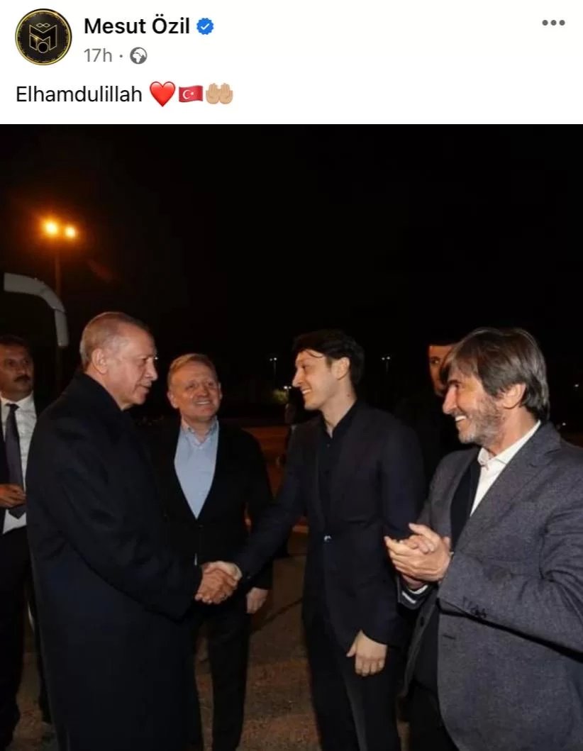 نشر اللاعب الألماني - التركي الاصل مسعود أوزيل صورة مع الرئيس رجب طيب اردوغان بعد فوزه بالأمس برئاسة بلاده لولاية ثالثة وقال "الحمدلله"