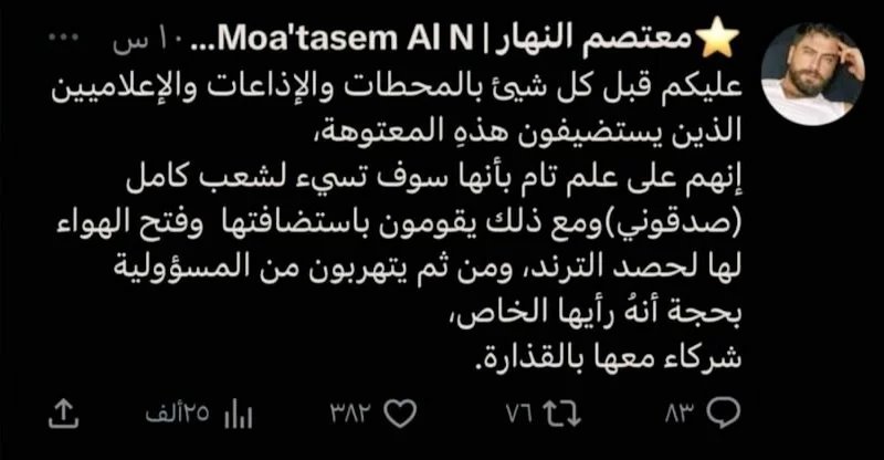 وقد كتب النهار عبر مواقع التواصل الاجتماعي: "عليكم قبل كل شيء بالمحطات والإذاعات والإعلاميين الذين يستضيفون هذهِ المعتوهة، إنهم على علم تام بأنها سوف تسيء لشعب كامل (صدقوني) ومع ذلك يقومون باستضافتها وفتح الهواء لها لحصد الترند، ومن ثم يتهربون من المسؤولية بحجة أنهُ رأيها الخاص، شركاء معها بالقذارة".