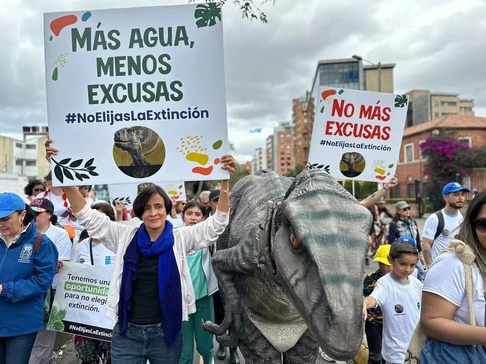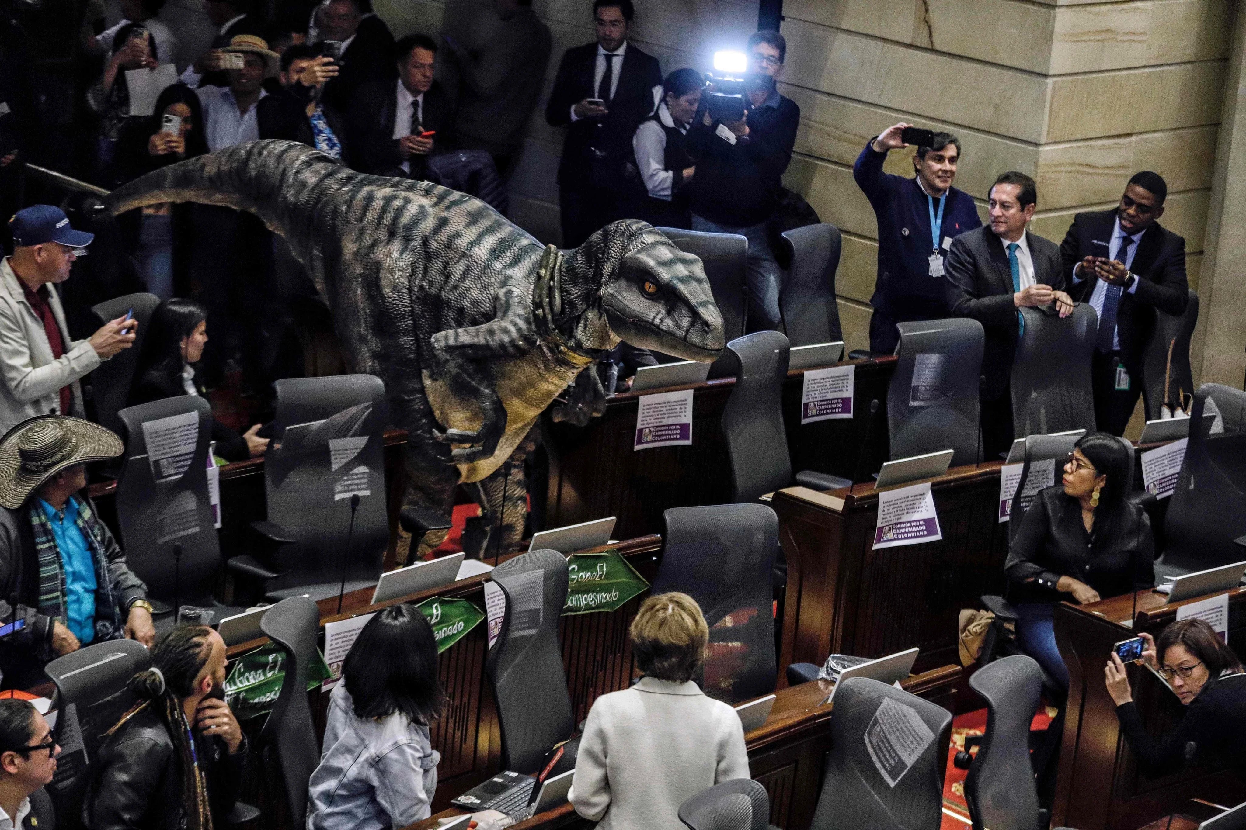 اقتحم ديناصور يدعى "فرانكى" البرلمان الكولومبى ليذكر البشر بأنهم من الممكن أن ينقرضوا بسبب التغيرات المناخية.