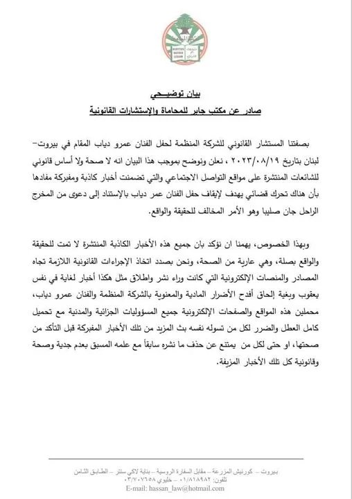 وأصدر المستشار القانوني للشركة المنظمة للحفل، مكتب جابر للمحاماة والاستشارات القانونية، بيانًا أكد فيه أنه "لا صحة ولا أساس قانوني للشائعات المنتشرة على مواقع التواصل الاجتماعي والتي تضمنت أخبار كاذبة ومفبركة مفادها بأن هناك تحرك قضائي يهدف لإيقاف حفل الفنان عمر دياب بالإستناد إلى دعوى من المخرج الراحل جان صليبا وهو الأمر المخالف للحقيقة والواقع".
