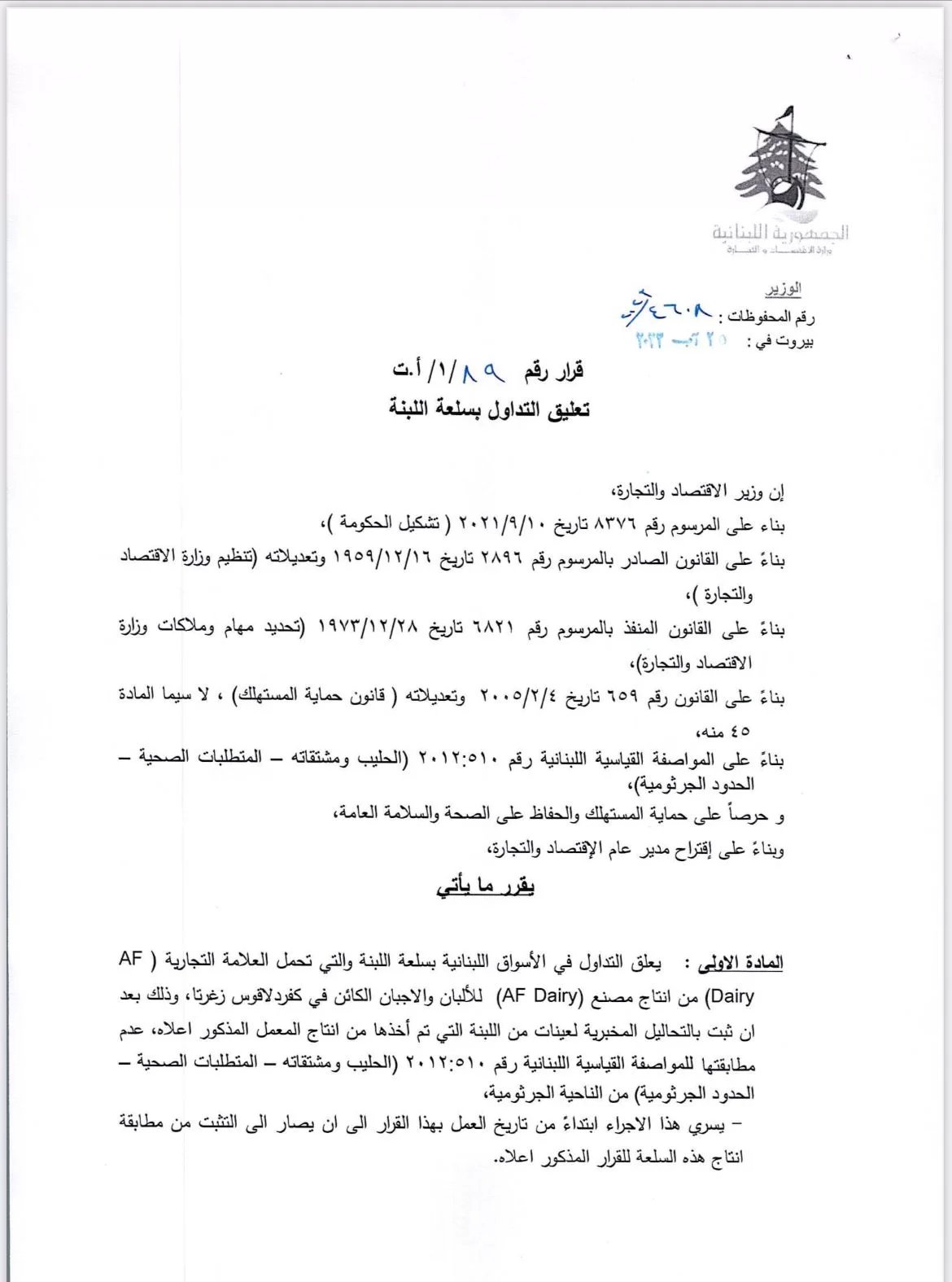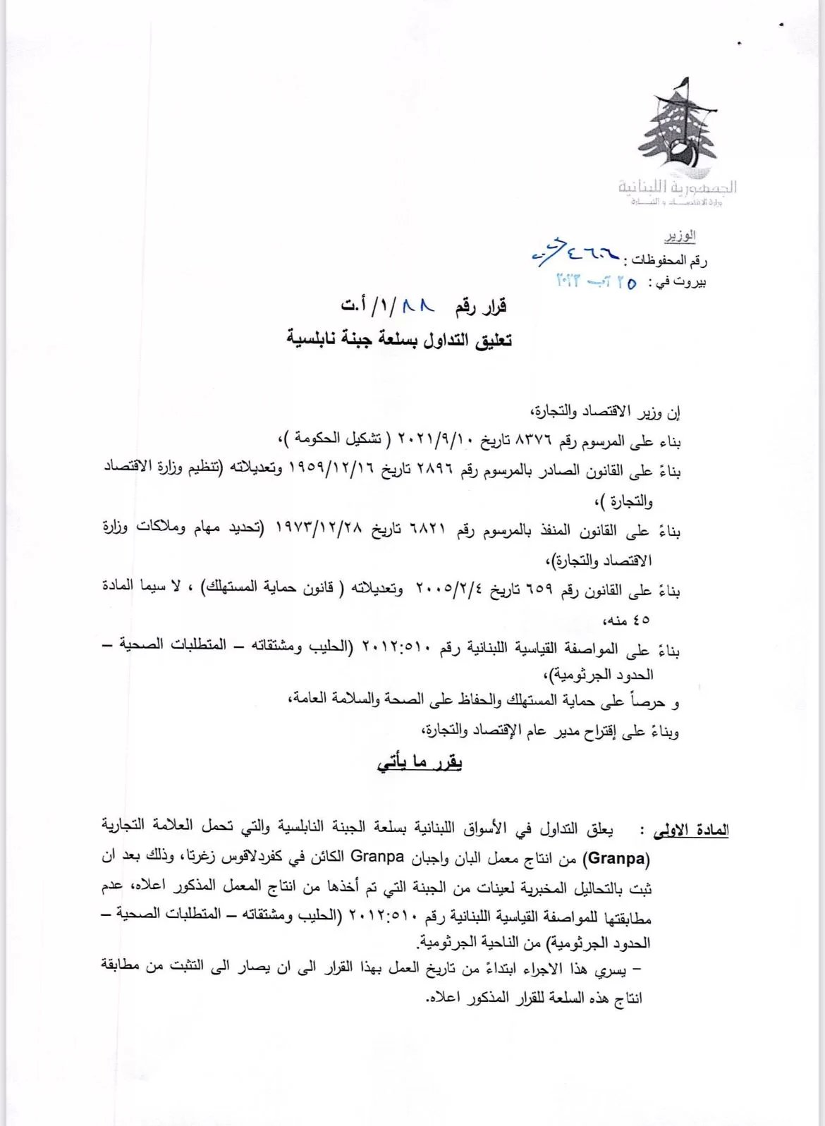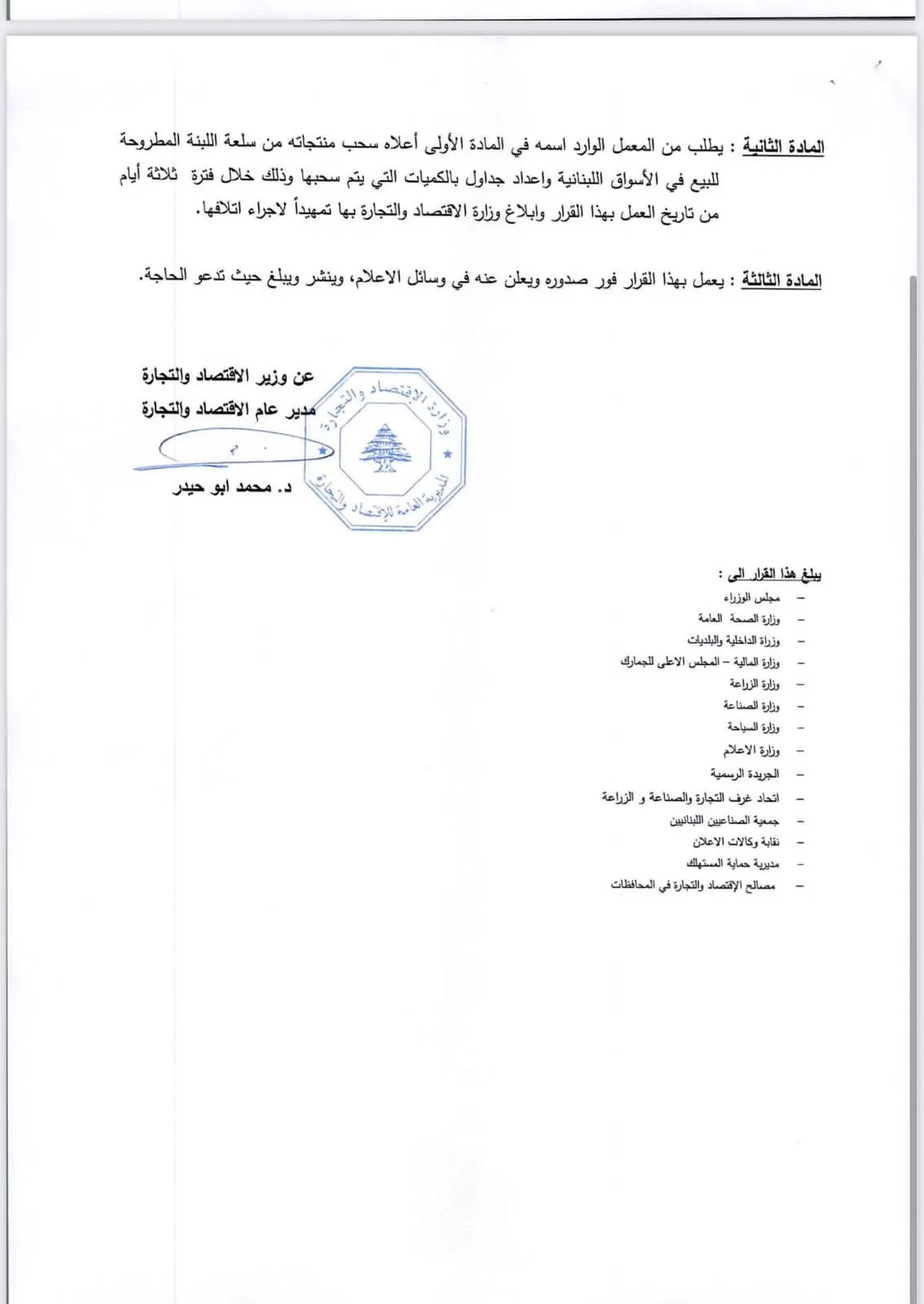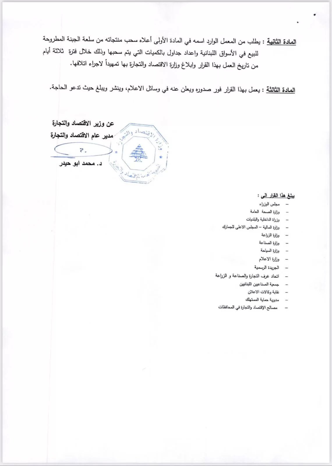 أصدر المدير العام للاقتصاد والتجارة الدكتور محمد أبو حيدر قرارا علق بموجبه التداول بصنفين من اللبنة والجبنة وطلب سحبهما من الاسواق.