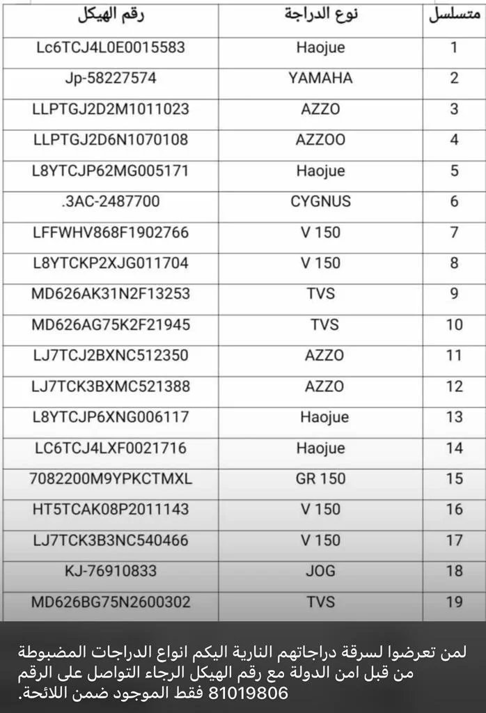 "في سياق متصل بتوقيفها عصابة لسرقة الدراجات النارية الأسبوع المنصرم، وتعميمها للائحة المسروقات على المواطنين الذين تعرضوا للسرقة، تعود المديرية العامة لأمن الدولة في النبطية وتعرض لائحة بأنواع الدراجات النارية وأرقامها، وتطلب من أصحابها التواصل معها على الرقم 81019806، وإحضار الأوراق الثبوتية الرسمية التي تثبت ملكيتهم لها، والحضور إلى مديرية أمن الدولة في النبطية لاستلامها".