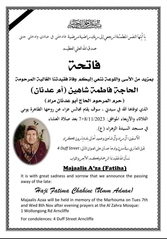الحاجة فاطمة شاهين (أم عدنان) في ذمة الله