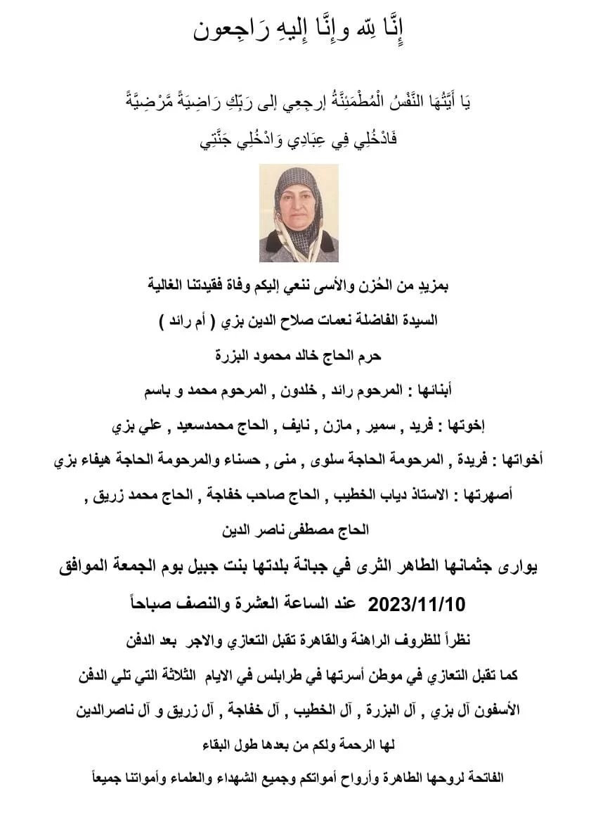 انتقلت الى رحمة الله تعالى المرحومة السيدة نعمات صلاح الدين بزي (أم رائد)