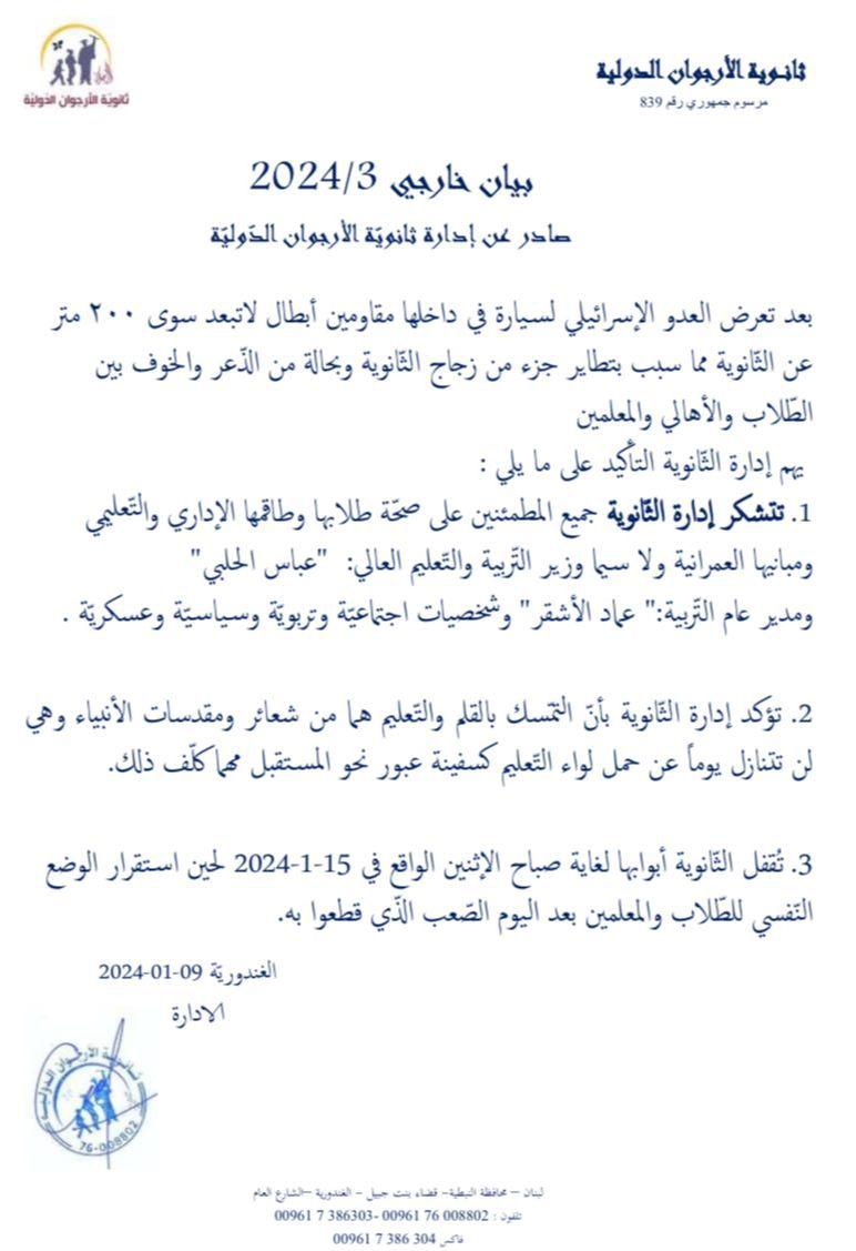 أعلنت ثانوية الأرجوان الدولية أنها ستقفل أبوابها حتى الإثنين 15-1-2024، بعدما قصف العدو الإسرائيلي اليوم سيارة قرب الثانوية، ما أدى إلى تطاير جزء من الزجاج، وإصابة الطلاب والمعلمين والأهالي بحالة من الخوف.