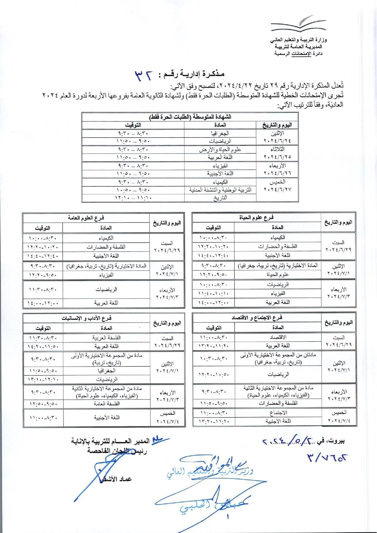 اصدرت وزارة التربية والتعليم العالي مذكرة ادارية اعلنت فيها مواعيد الامتحانات الخطية للشهادة المتوسطة (الطلبات الحرة) ولشهادة الثانوية العامة بفروعها الاربعة وجاءت على الشكل التالي: