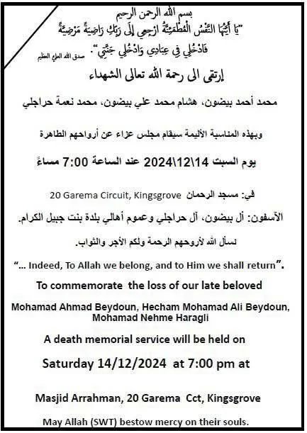 مجلس عزاء عن أرواح السعداء محمد أحمد بيضون وهشام محمد علي بيضون ومحمد نعمة حراجلي في سيدني - استراليا