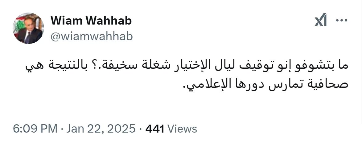 كتب رئيس حزب التوحيد العربي الوزير السابق وئام وهاب عبر حسابه على منصة "أكس": "ما بتشوفو إنو توقيف ليال الإختيار شغلة سخيفة؟ بالنتيجة هي صحافية تمارس دورها الإعلامي".