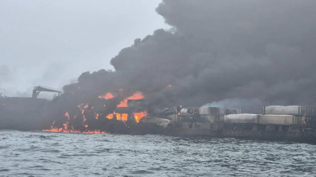 ووفقًا لموقع "مارين ترافك" الذي يتتبع تفاصيل السفن التجارية، فإن سفينة الشحن البرتغالية، المسجلة في ماديرا، تحمل اسم "سولونج"، وكانت متجهة نحو هولندا قبل أن تصطدم بناقلة النفط التي اشتعلت فيها النيران.