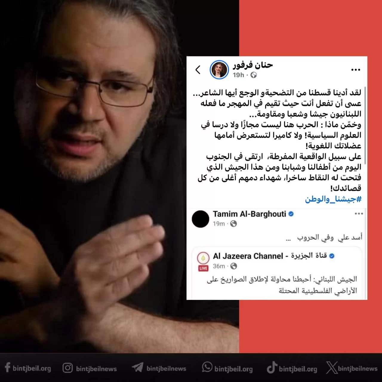 بعد أن أهان الجيش اللبناني إثر اكتشافه خلية تطلق الصواريخ من جنوب لبنان، رد لبنانيون على الشاعر الفلسطيني تميم البرغوثي، وأبرزهم رد الشاعرة الجنوبية حنان فرفور: "لقد أدّينا قسطنا، عسى أن تفعل أنت حيث تقيم في المهجر ما فعله اللبنانيون، ودماء شهداء الجيش أغلى من كل قصائدك."