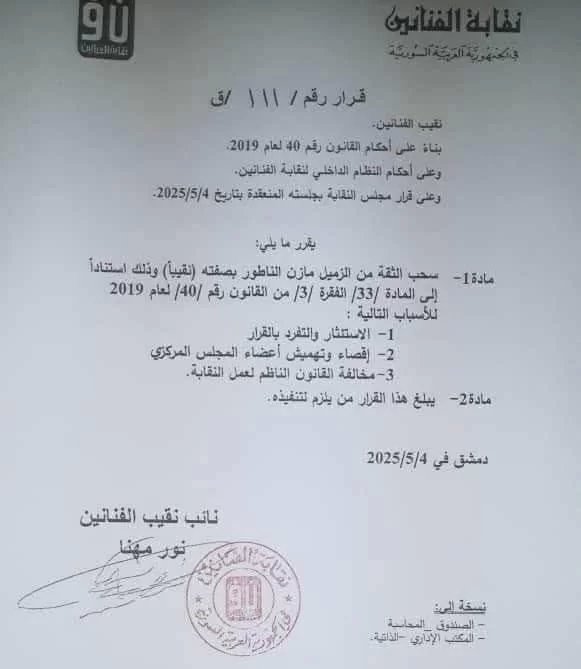 سحب مجلس نقابة الفنانين السوريين، الأحد، الثقة من نقيب الفنانين مازن الناطور وذلك بسبب "تفرده بالقرار ومخالفة قانون النقابة".