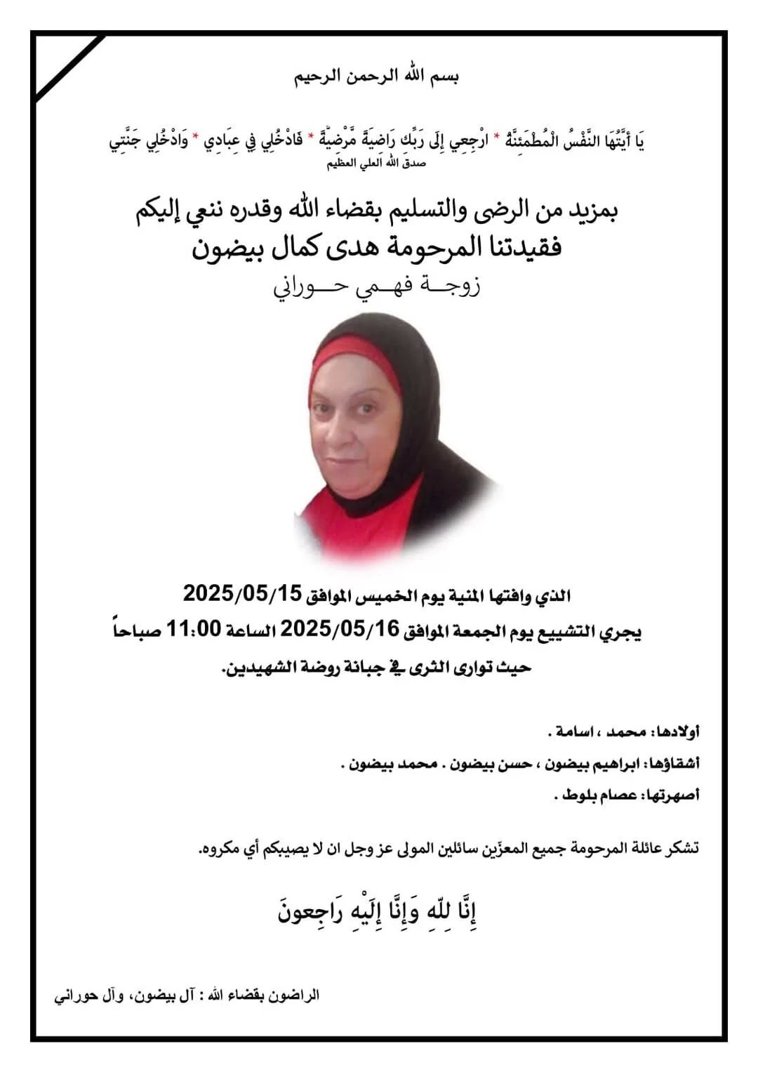 انتقلت الى رحمة الله تعالى المرحومة "هدى كمال بيضون" عيال فهمي حوراني وهي من بنت جبيل حدد موعد الدفن يوم غدٍ الجمعة في روضة الشهيدين في بيروت