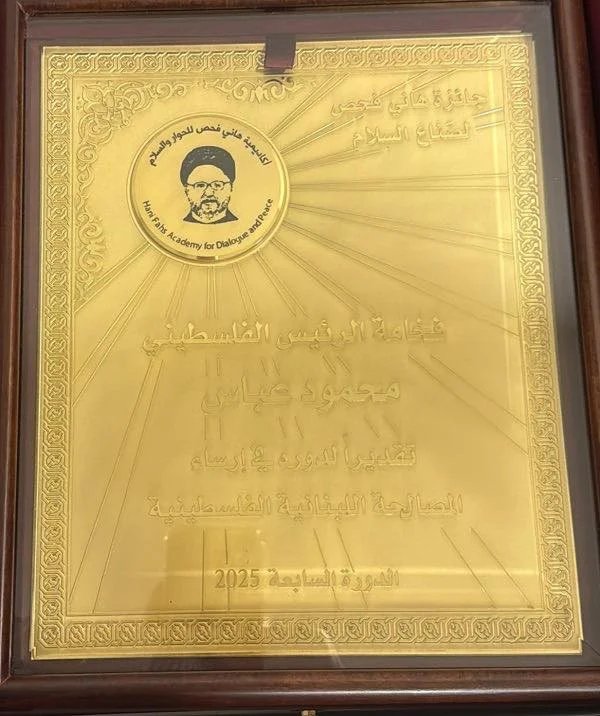 كرمت "أكاديمية هاني فحص للحوار والسلام"، برعاية رئيس مجلس الوزراء نواف سلام، الرئيس الفلسطيني محمود عباس، في احتفال أقيم، مساء اليوم، في مركز التدريب والمؤتمرات التابع لشركة "طيران الشرق الأوسط - الإدارة العامة" - طريق المطار، ومنحته جائزة "صناع السلام"، تقديرا لدوره في إرساء المصالحة اللبنانية – الفلسطينية.