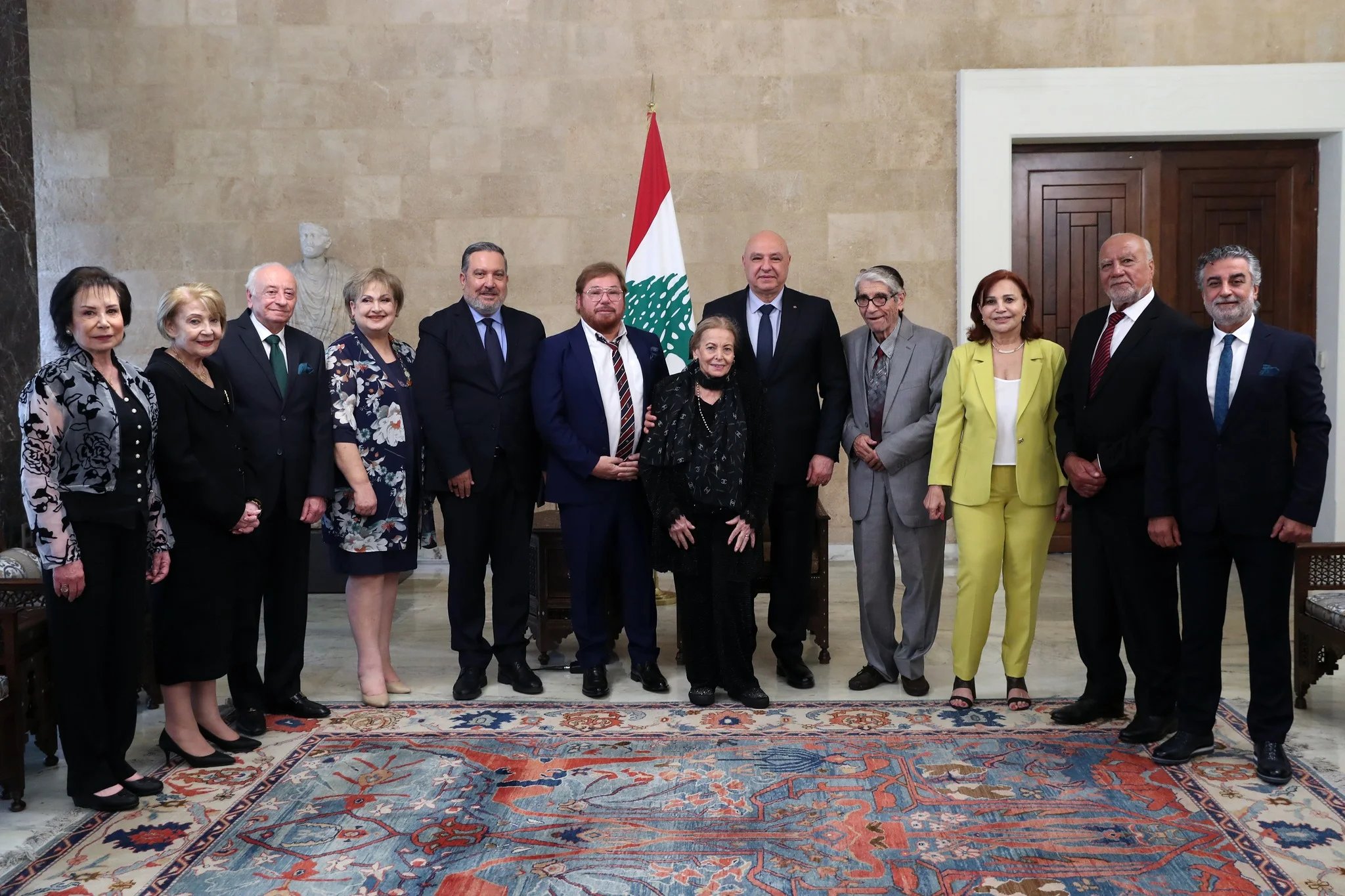 استقبل رئيس الجمهورية العماد جوزاف عون في قصر بعبدا بعد ظهر اليوم، رئيس مهرجان "الزمن الجميل" الدكتور هراتش ساغبزاريان، مع وفد من أعضاء اللجنة المنظمة ضم الفنانين والإعلاميين: صلاح تيزاني (أبو سليم)، وفاء طربيه، احمد العشي، سعاد قاروط العشي، مي متى، جاندارك أبو زيد فياض، زاهي وهبي، طوني ابي كرم، خالد السيد والفيرا يونس.