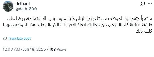 تفاعل واسع منذ الامس بعد السابقة إلاعلامية الخطيرة لوليد عبود الذي خرج عن كل قواعد المهنية وشن هجوماً طائفياً مباشراً على الشيعة في مقدّمة مسيئة تفوح منها رائحة التحقير والتخوين، متهماً إياهم بالولاء لإيران وداعياً إياهم إلى الرحيل دون أن يميز بين حزب وطائفة مستقوياً ربما بالاحداث الحاصلة كما لم يفعل من قبل.. في لحظة يبدو فيها أن الإهانة كانت إما مدفوعة الثمن أو بانتظار الدفع وفي سلوك اعلامي لا يعبر إلا عن انحطاط اخلاقي وانفصال تام عن الواقع الوطني اللبناني.