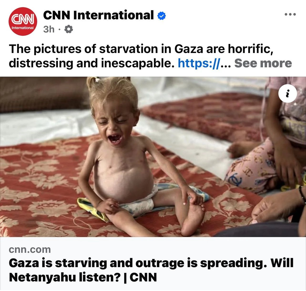 نشرت محطة CNN الأميركية تقريراً يصوّر مشاهد مروّعة من غزة: أطفال بهياكل عظمية، جثث جائعة، وأجهزة دولية عاجزة عن إيصال المساعدات، فيما تُترك قوافل الغذاء تنتظر الإذن الإسرائيلي عند المعابر. المأساة ليست مفاجِئة، بل متوقعة، بحسب منظمات الإغاثة التي حذّرت منذ شهور من هذه النتيجة في ظل سياسة “التجويع المنهجي” التي تتّبعها إسرائيل بذريعة محاربة حماس.
