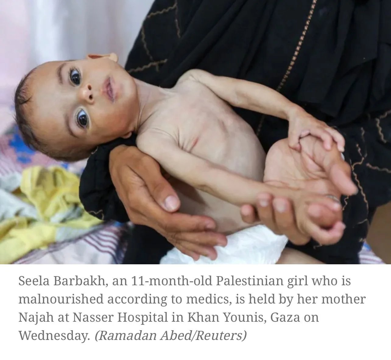 -سيلا بربخ، رضيعة لم تكمل عامها الأول، تمسك بها أمها عاجزة، في مستشفى ناصر بخان يونس.
