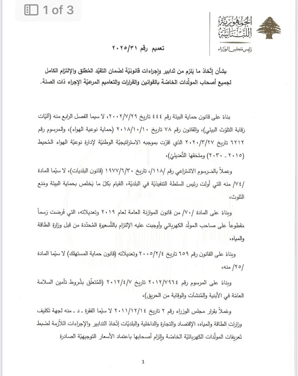 وطلب التعميم من الجهات المعنية، وبالتنسيق مع وزارات الطاقة والمياه، الاقتصاد والتجارة، الداخلية والبلديات، العدل والبيئة، اتخاذ الإجراءات القانونية اللازمة للتأكد من التزام أصحاب المولدات بالقوانين والتسعيرات الرسمية الصادرة عن وزارة الطاقة، وتركيب العدادات الإلكترونية والفلاتر المطابقة للمواصفات، وتقديم التصاريح المطلوبة والامتثال للشروط البيئية.
