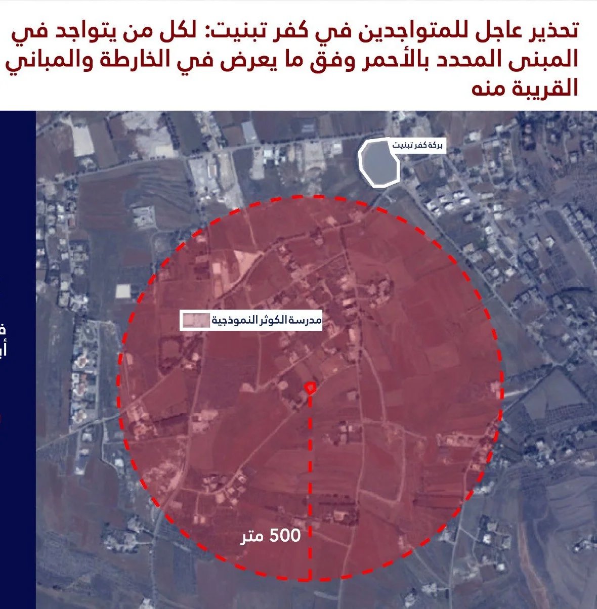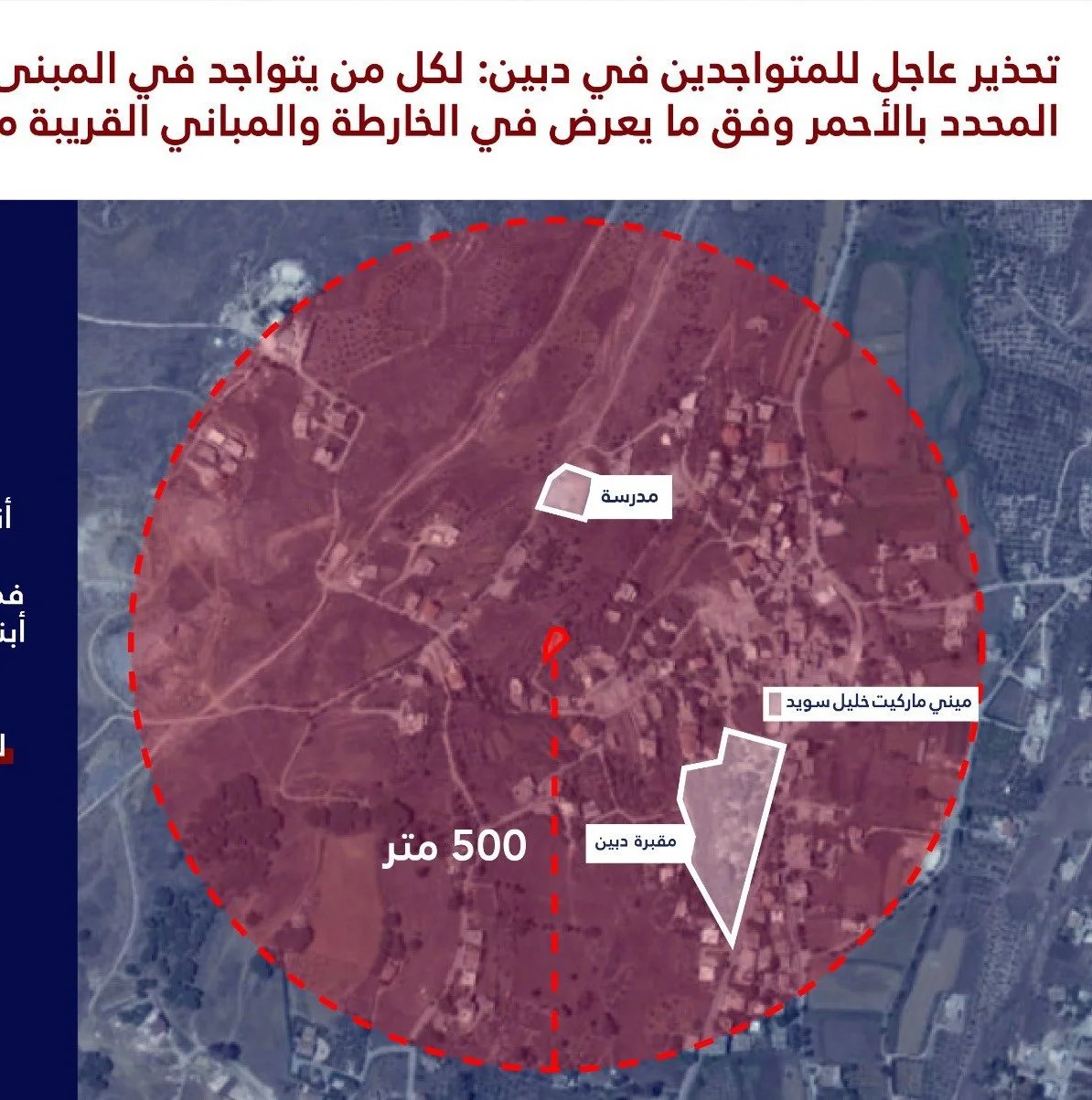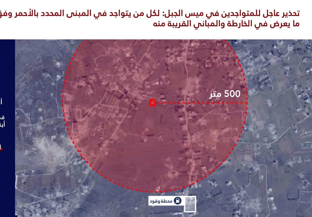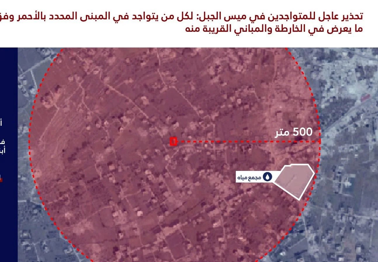 ووجه "تحذيرا عاجلا إلى سكان المباني المحددة بالأحمر في الخرائط المرفقة والمباني المجاورة لها في القرى التالية: ميس الجبل، كفر تبنيت ودبين"، ودعاهم الى "اخلاء تلك المباني والمباني المجاورة لها فورا والابتعاد عنها لمسافة لا تقل عن 500 متر".
