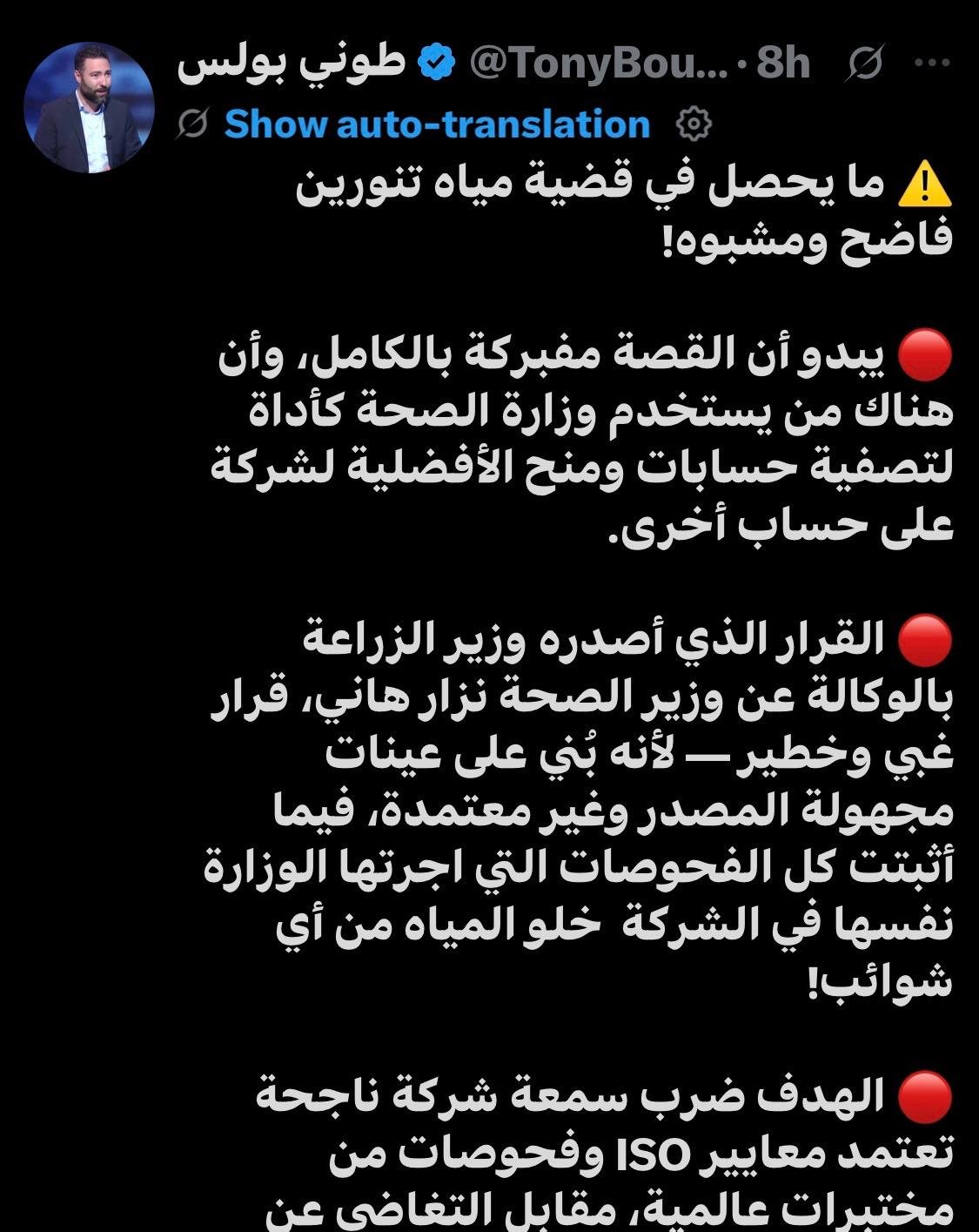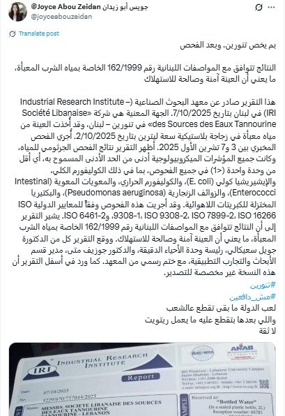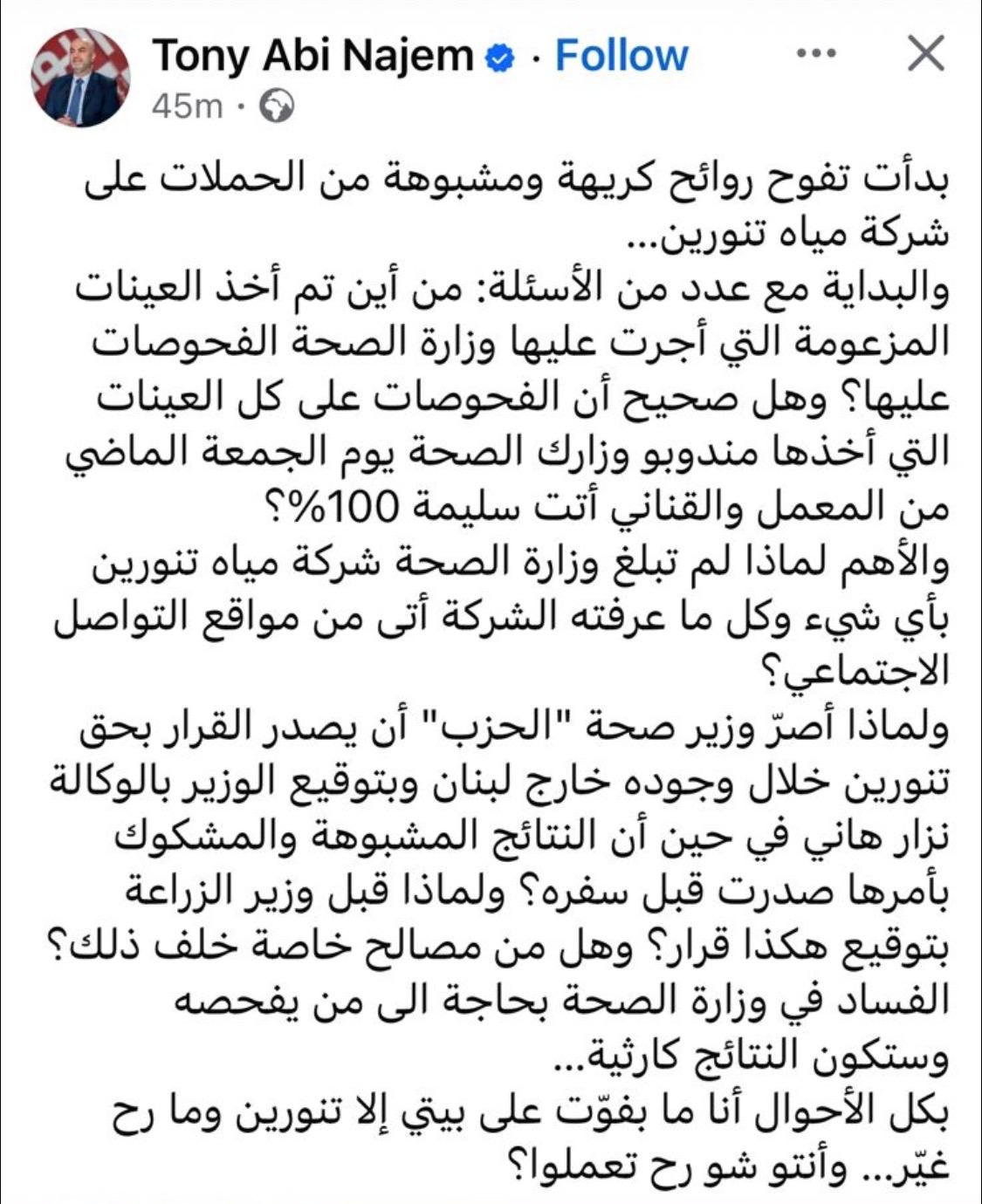 هذا وأصدر وزير الصحة ركان ناصرالدين بيان، ردًا على منتقدي القرار، أوضح فيه أن الوزارة تتابع بمسؤولية مسار فحص عينات أخرى من مياه الشرب الموجودة في الأسواق باسم "تنورين" في المختبرات وهي بانتظار آخر النتائج ليبنى على الشيء مقتضاهـ وكذلك باشرت اخذ عينات من عبوات مياه الشرب الموجودة في الاسواق والعائدة لغالبية الشركات لفحصها والتأكد من سلامتها وجودتها.