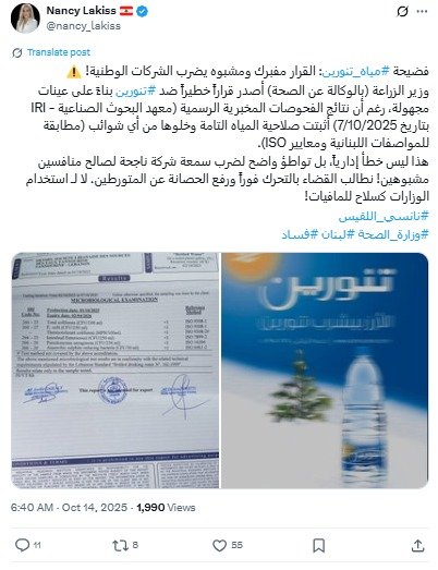 أصدرت وزارة الصحة العامة أمس قرارًا بتوقيف شركة "مياه تنورين" عن تعبئة المياه وسحب منتجاتها من الأسواق، بعد ثبوت تلوث بعض العبوات ببكتيريا ضارّة، وفق نتائج الفحوصات المخبرية.