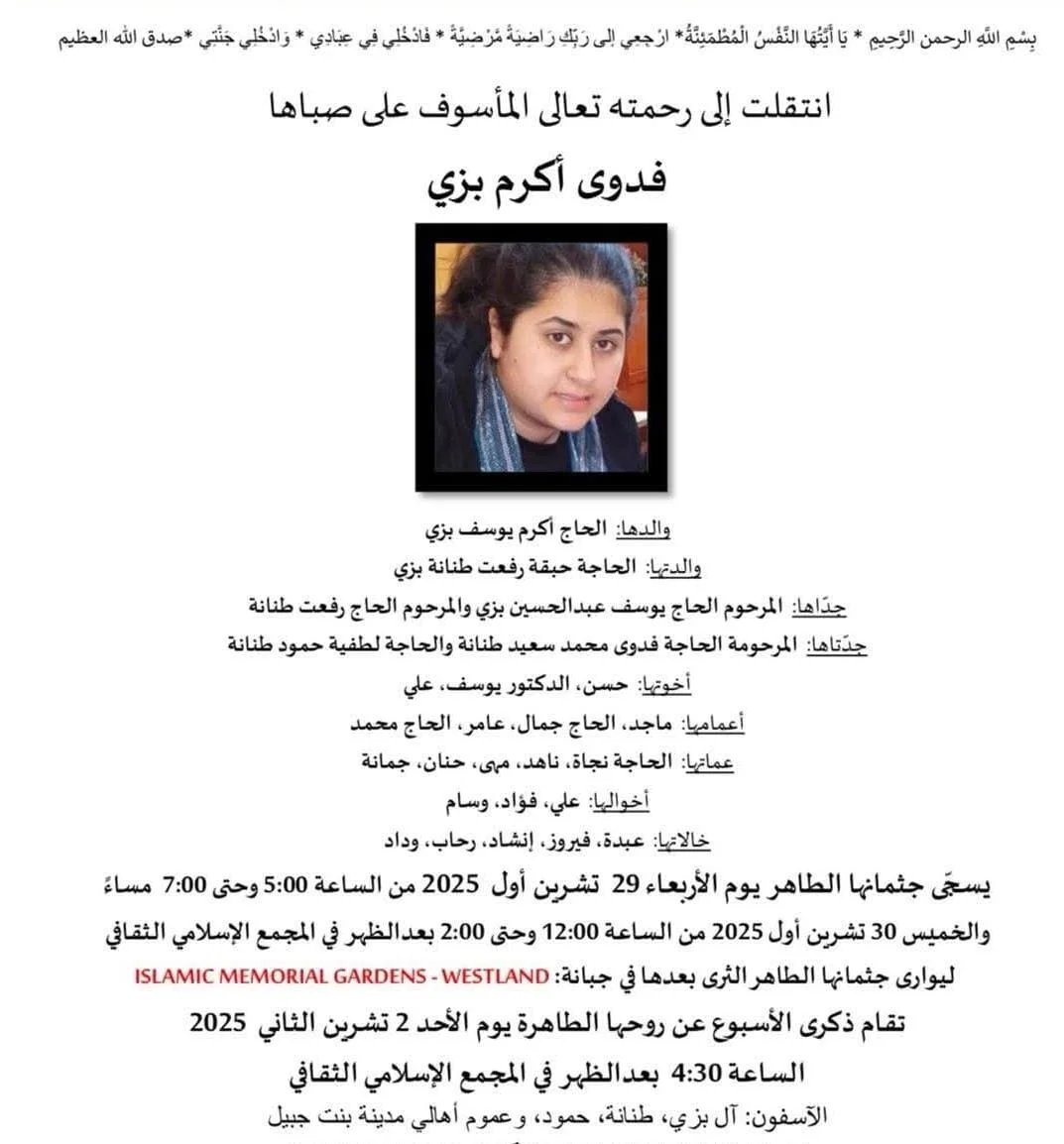 إنتقلت إلى رحمة الله تعالى المرحومة المأسوف على صباها "فدوى أكرم بزي" وتقام مراسم الدفن في أميركا