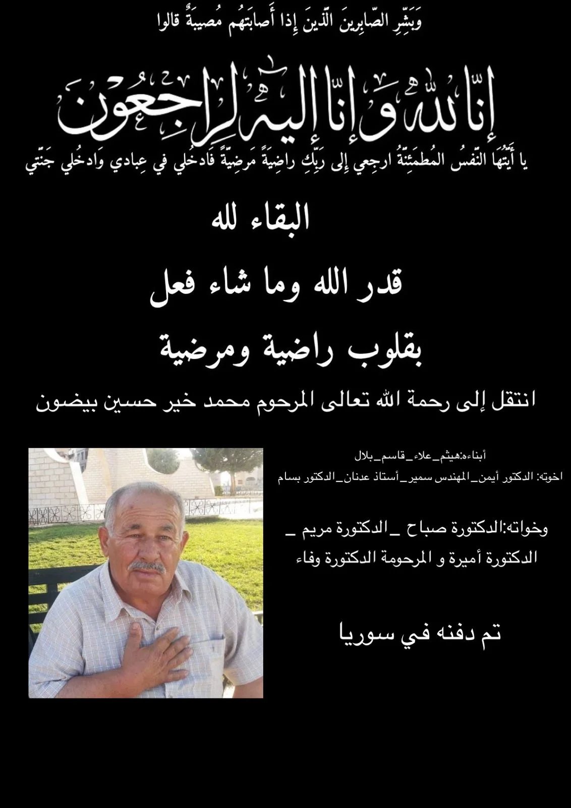 انتقل الى رحمة الله تعالى المرحوم محمد خير حسين بيضون وتم دفنه في سوريا