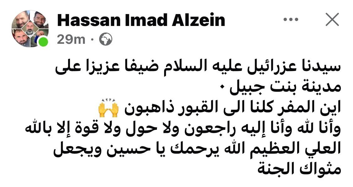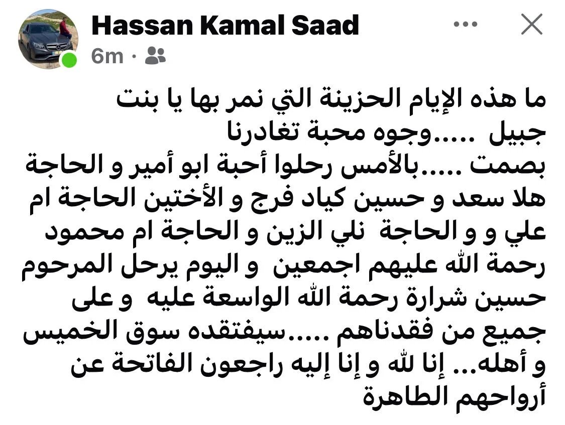 نعى أبناء بنت جبيل ابن المدينة حسين شرارة. حسين، المناضل البسيط والعنيد الذي كان عاشقا لتراب الجنوب رحل بعد عمر من العطاء، وظل ثابتًا على قناعاته حتى اللحظة الأخيرة.