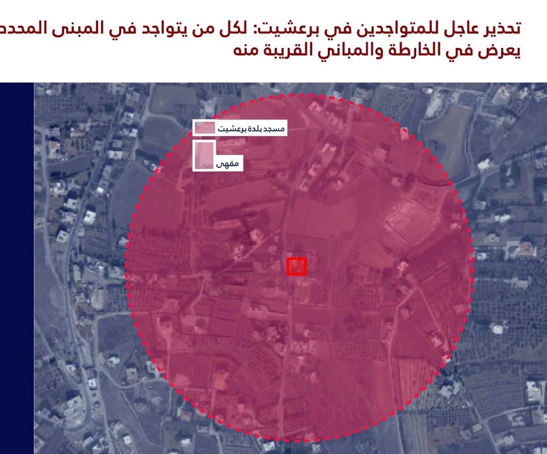 جه المتحدث بلسان جيش العدو الاسرائيلي افيخاي ادرعي تهديدا جديدا إلى سكان بلدتي مجادل وبرعشيت، وحدد باللون الاحمر على خريطة، المباني التي سيتم استهدافها.