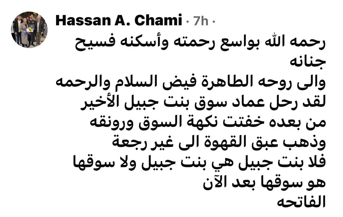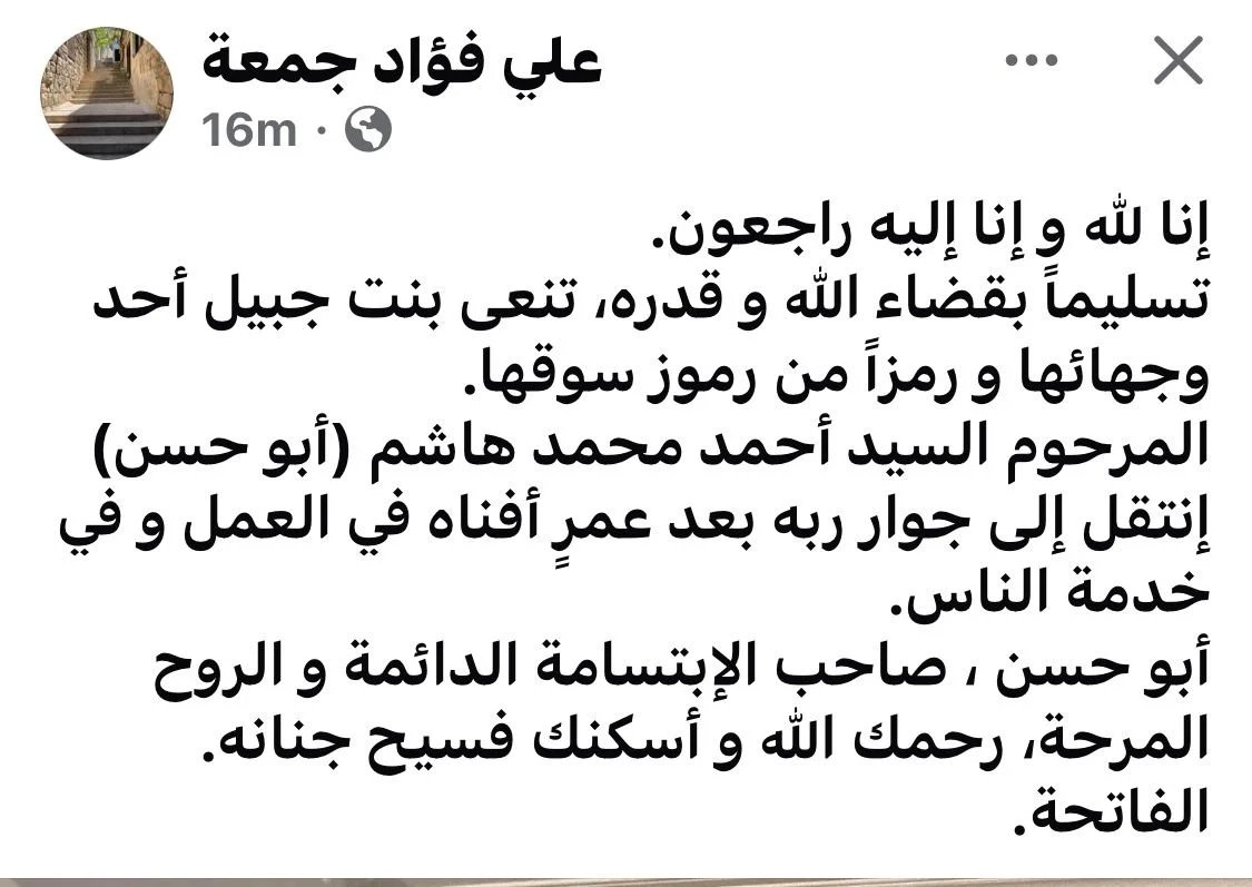 استفاقت مدينة بنت جبيل على خبر حزين بعد وفاة المختار السيد محمد أحمد ذيب هاشم (أبو حسن) بعد صراع مع المرض.
