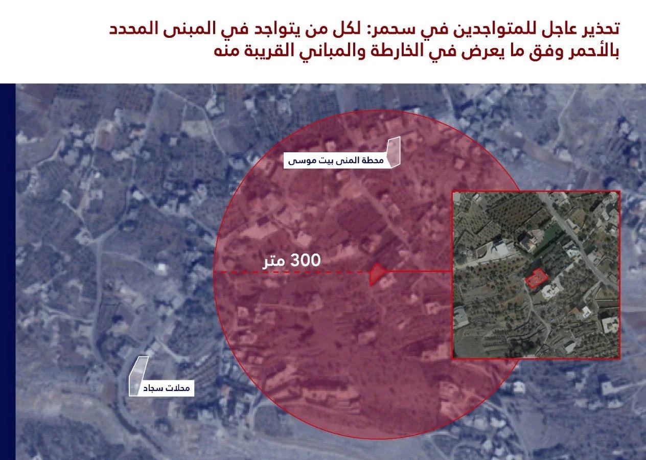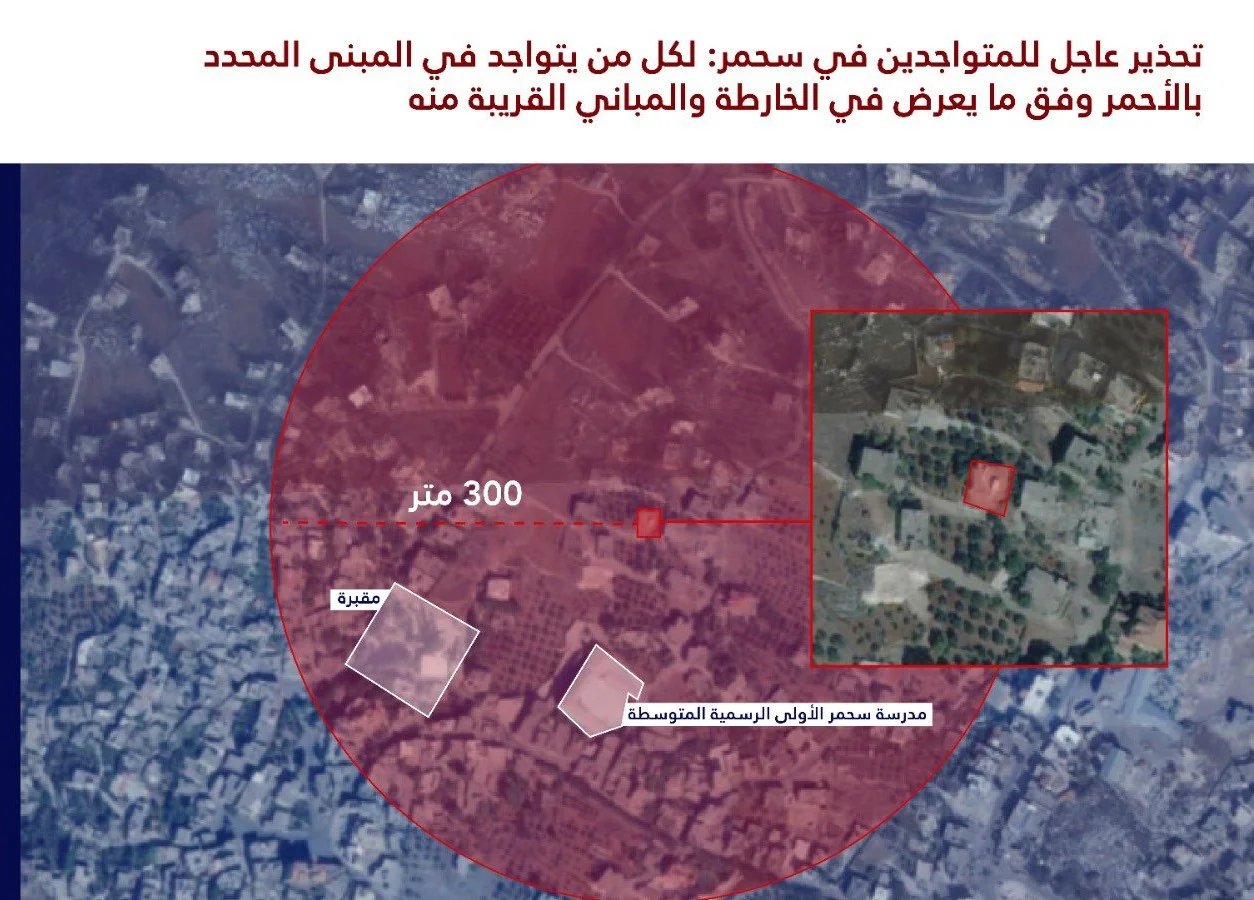 أصدر المتحدث بإسم جيش الإحتلال إنذارا بإخلاء مبان سكنية في قرية سحمر بالبقاع الغربي في لبنان