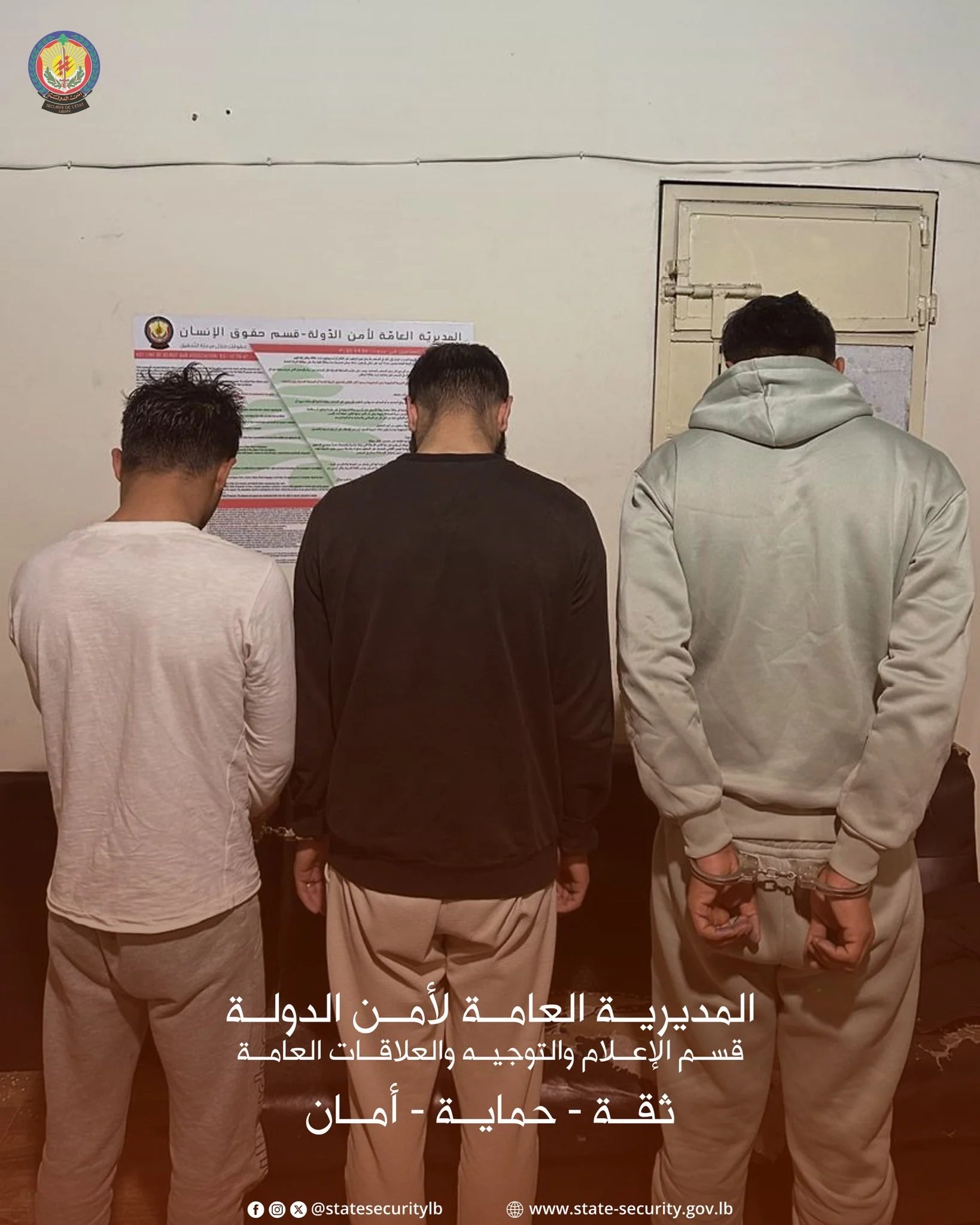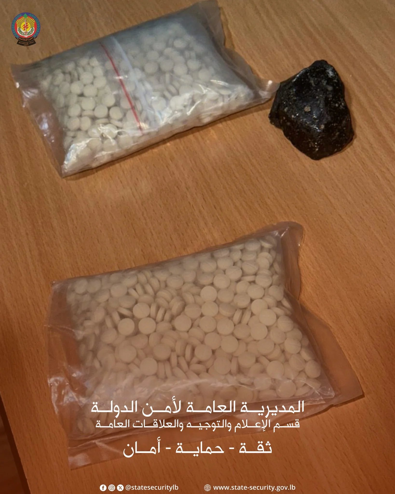 صدر عن المديرية العامة لأمن الدولة – قسم الإعلام والتوجيه والعلاقات العامة، البيان الآتي: في إطار الجهود المتواصلة التي تبذلها المديرية العامة لأمن الدولة لمكافحة آفة المخدرات، ونتيجة رصدٍ ومتابعة دقيقة، أوقفت مديرية البقاع الإقليمية – مكتب زحلة، بتاريخ 17/1/2026، كلاً من السوريّين (م. ر.)، (أ. م. م.) و(س. ع. ب.)، في منطقة البقاع الأوسط، حيث ضُبط بحوزتهم كمية كبيرة من حبوب الكبتاغون يقومون بترويجها عبر التوك توك. وقد أجري المقتضى القانوني بحقهم بناءً لإشارة القضاء المختص".