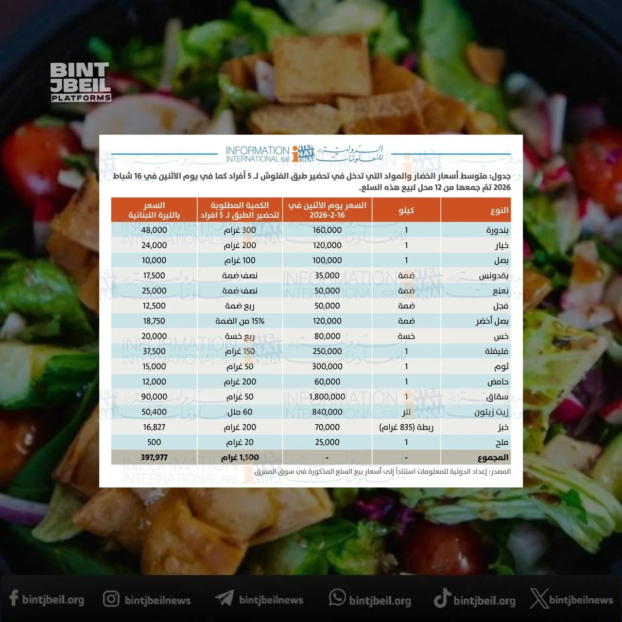 جدول: متوسط أسعار الخضار والمواد التي تدخل في تحضير طبق الفتوش لـــ 5 أفراد كما في يوم الاثنين في 16 شباط 2026 تمّ جمعها من 12 محل لبيع هذه السلع.